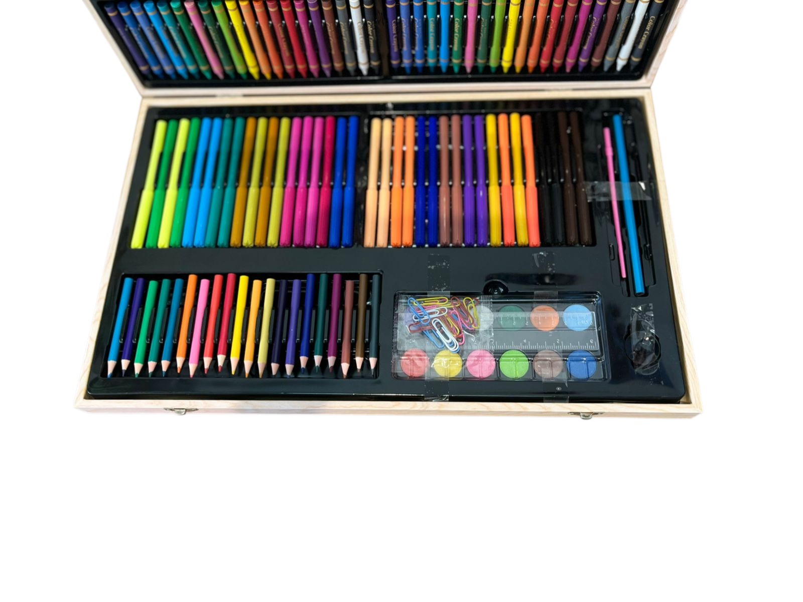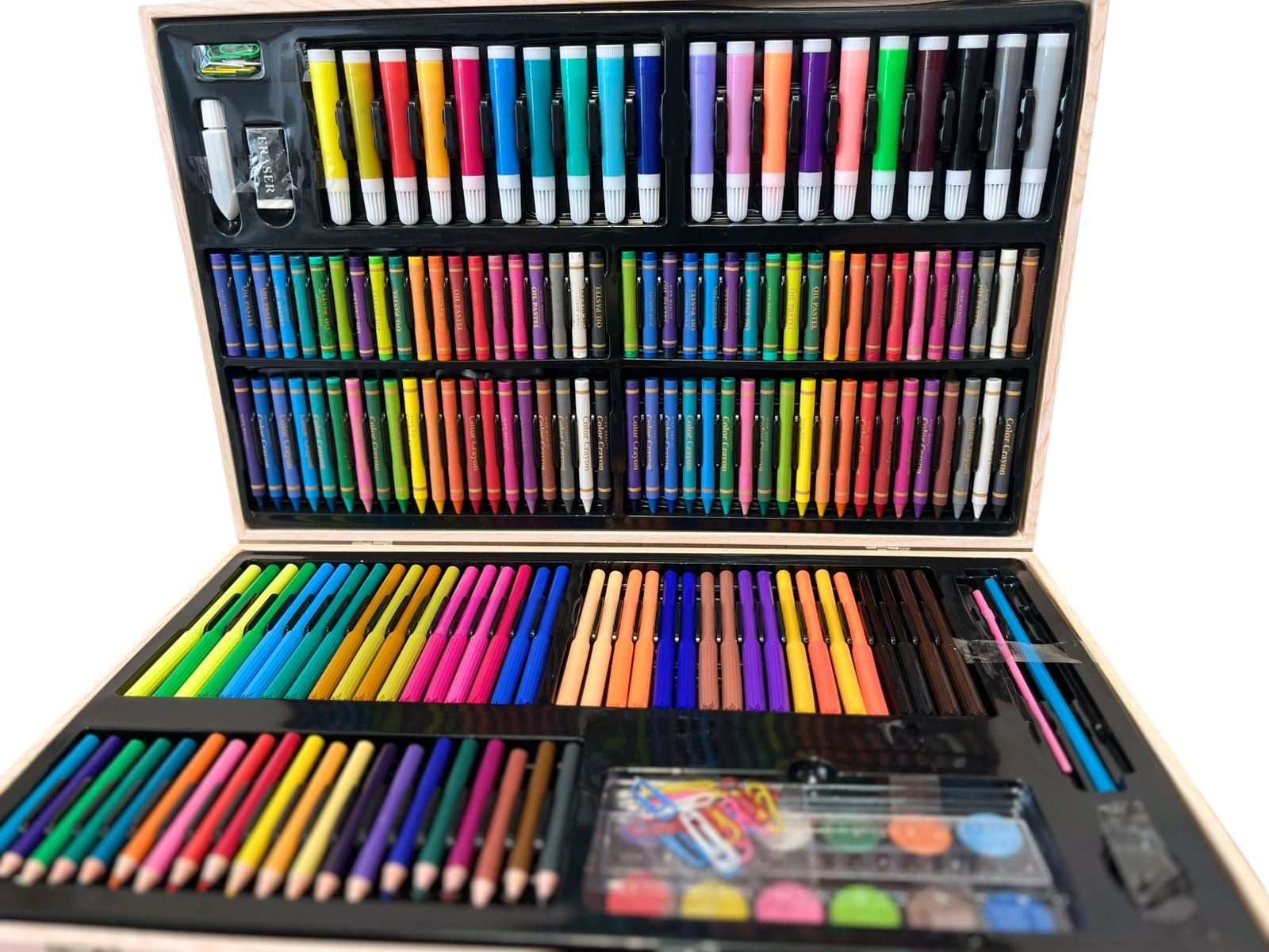 • Contenido: Set de arte integral con más de 200 piezas (Crayones, pasteles, lápices, marcadores, acuarelas y accesorios de oficina).